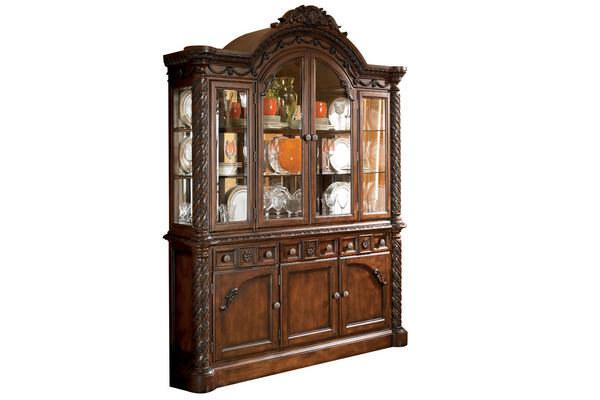 A deep rich stained finish and exquisite details come together to create the ultimate in grand traditional design with the North China Cabinet. The opulent brown finish and hand-carved wooden frames will create an elegant atmosphere in your dining area. This china cabinet features a mirror back, glass cabinet doors and extra storage under the china deck.