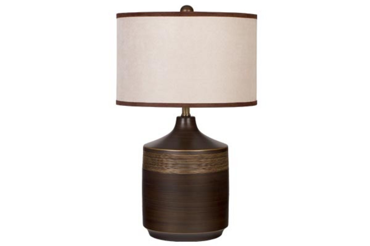 The Karissa Table Lamp is a brown and gold finished ceramic table lamp topped with a faux suede drum shade and operates on a 3-way switch. Lamps shine a bright light on sophisticated style—the perfect accompaniment to contemporary decor.