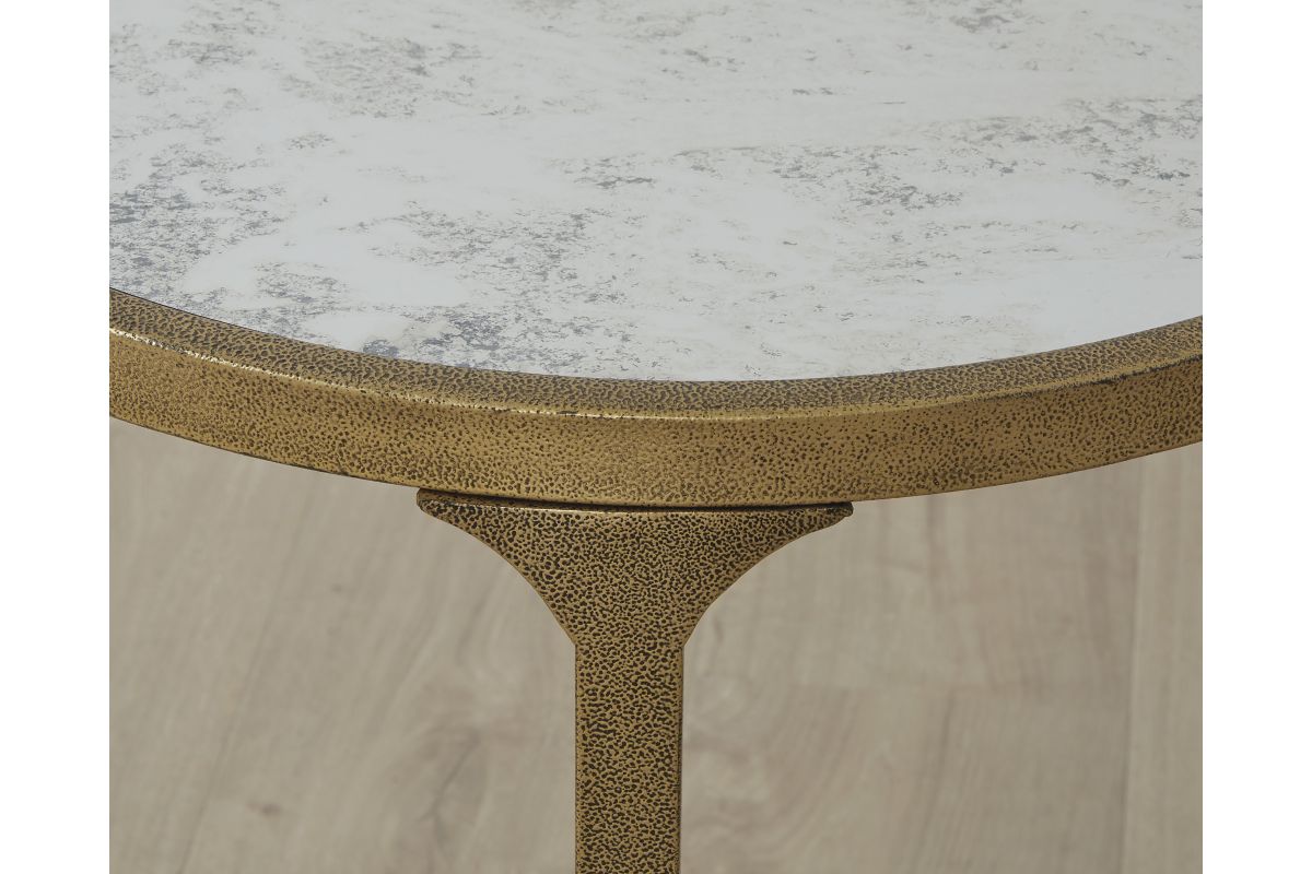 This end table blends a traditional feel with contemporary design cues. Antiqued gold texturing on the frame has the look of timeworn, hand-forged metal. A tempered glass top with a faux marble finish provides a refined contrast. Chic when hosting decor, a lamp or holding entertainment essentials, this table rounds out your living room with transitional flair.