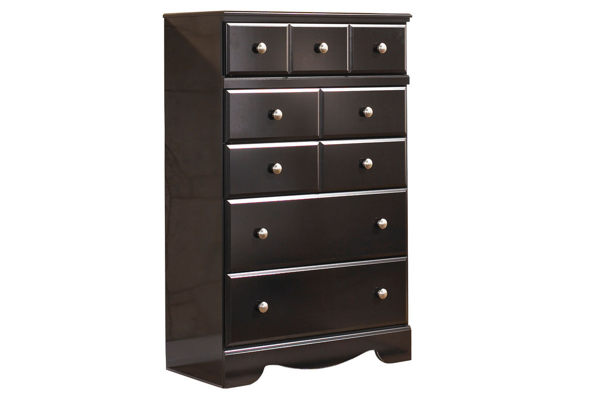 The Shay Chest's modern design will reinvigorate any bedroom. The contemporary almost-black paint finish features a rich merlot undercoat that compliments the straight-lined design. This chest is constructed with solid woods and veneers as well as brushed silver hardware.