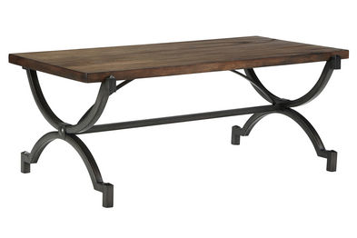 A perfect fit with any style, the Rustic Brown Cocktail Table features a unique metal stretcher base that is topped with a thick, wood veneered slab. The table frames are made with tubular metal in a bronze toned finish with glaze accent. Mindi wood veneer table top in rich brown finish.