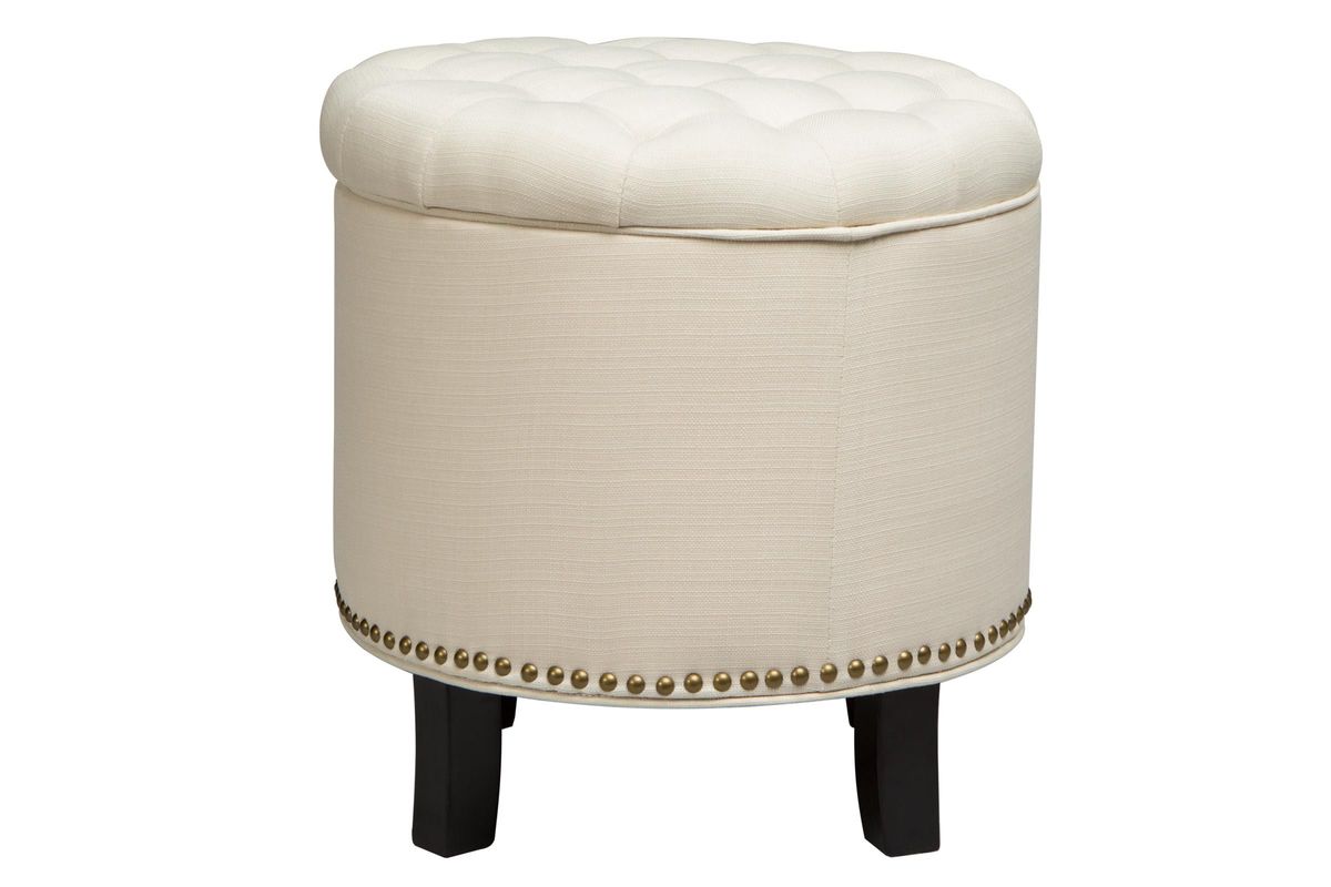 Add the Round Quilt Top Ottoman to your home for extra flair and character. The tufted top comes off to reveal a storage space. The nailhead trim at the bottom of this ottoman adds an extra emphasis of stylish design.