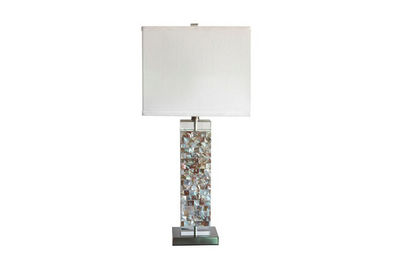 With its exquisite base, this shell table lamp radiates with an iridescent luster. Ultra-linear design brings a decidedly modern point of view to your space.
