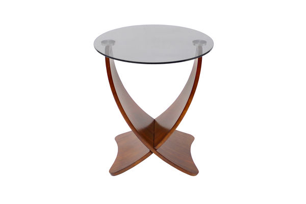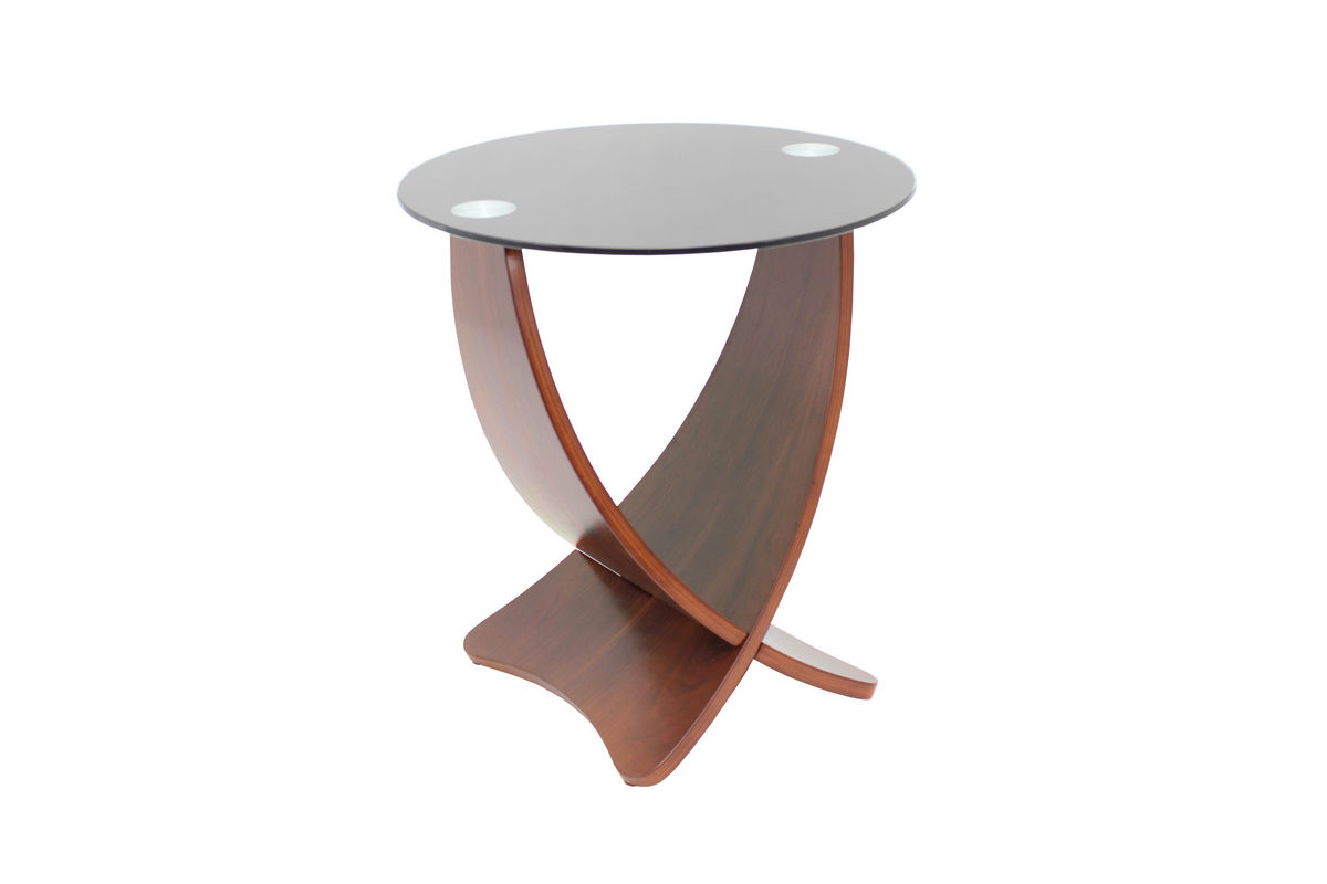 This bent wood end table pairs perfectly with the Criss Cross Coffee Table. Smoked glass perched on bent wood legs make this a striking piece. The lower portion can also be used as a magazine rack.